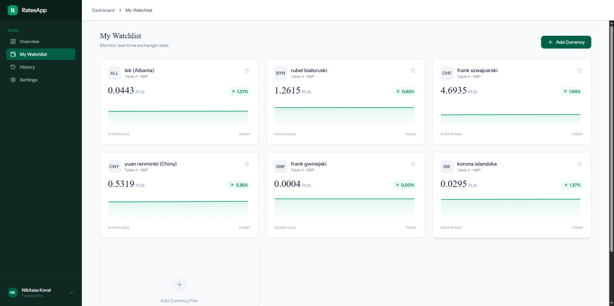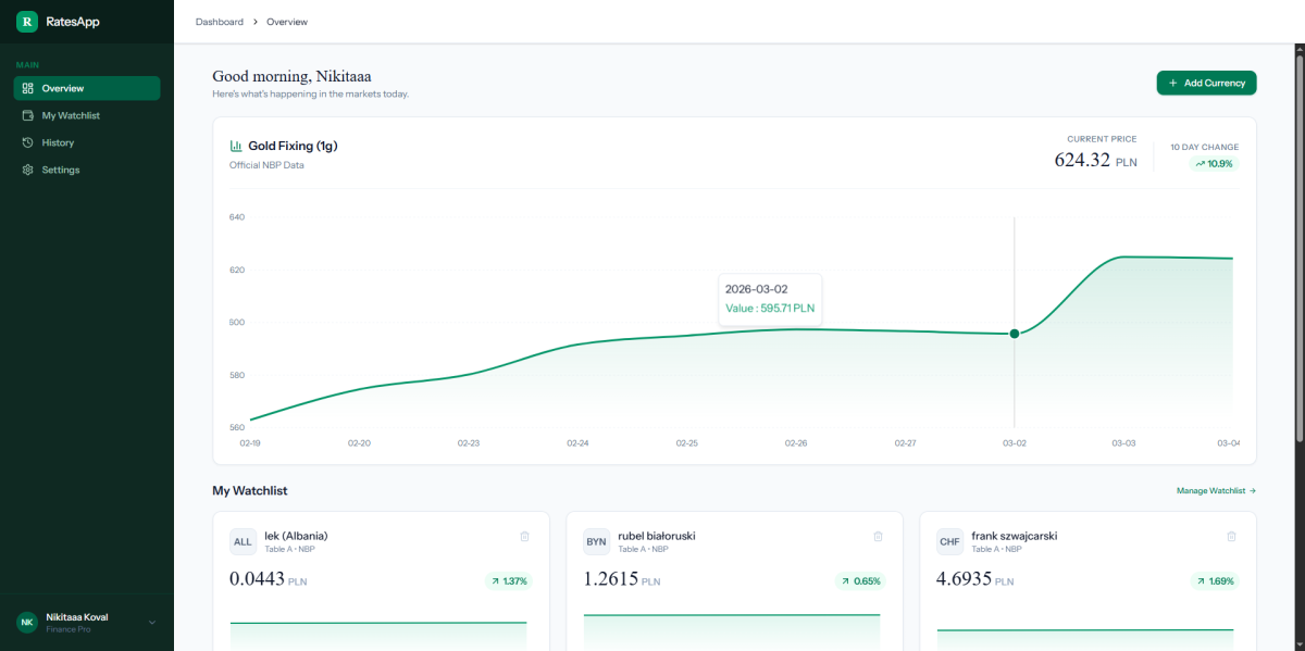 The application centers around a personalized dashboard that greets users by time of day and displays an overview of market activity. The main dashboard includes a gold fixing chart showing the official NBP gold price per gram in PLN over the last ten days, with a percentage change indicator and an area chart visualization. Users maintain a custom watchlist of currencies they care about. Each watchlist card shows the current PLN mid-rate, a small sparkline of recent trends, and quick links to the history page for deeper analysis. Currencies can be added or removed from the watchlist through a searchable modal that filters by name or code across all available NBP Table A currencies.
