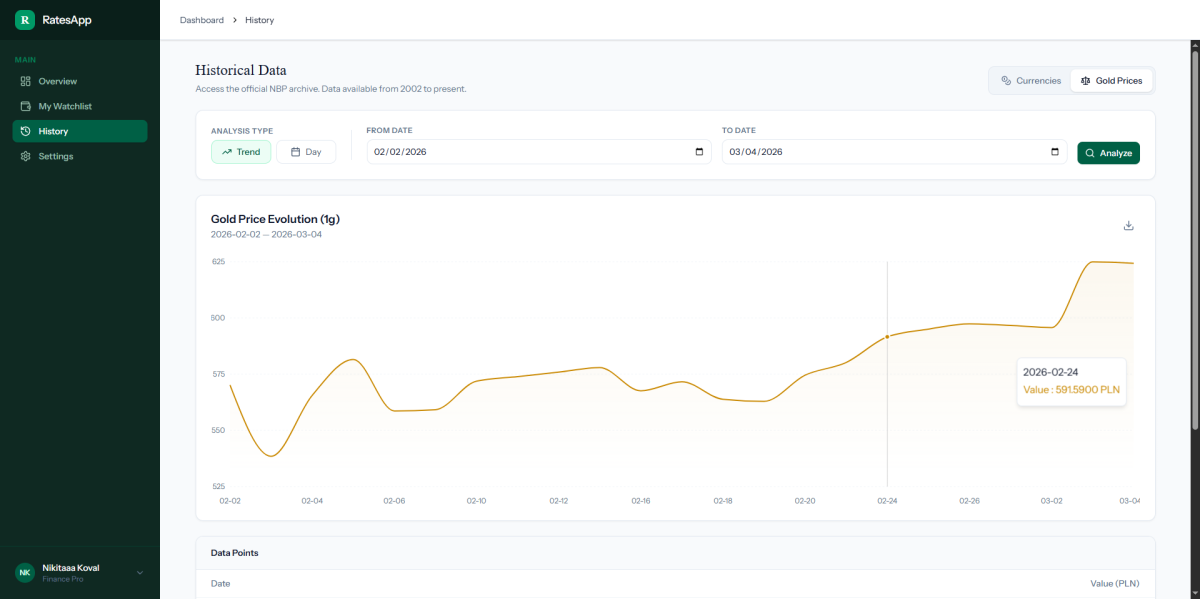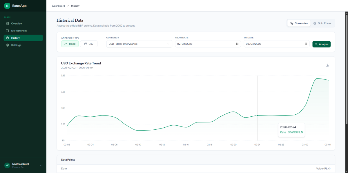 The history page offers two analysis modes. In trend mode, users select a date range and optionally a currency (or gold) to fetch historical data. The results are presented as an interactive area chart and a data table with date, value, and NBP table number where applicable. The table supports expanding to view all rows and includes keyboard-friendly navigation for accessibility. In single-day mode, users retrieve the exact official rate for a specific date, useful for invoice verification or audit compliance. Data can be exported to CSV for use in spreadsheets and reporting. The history API enforces a maximum range of 93 days for exchange rates and uses appropriate date bounds for gold (from 2013) and currencies (from 2002).