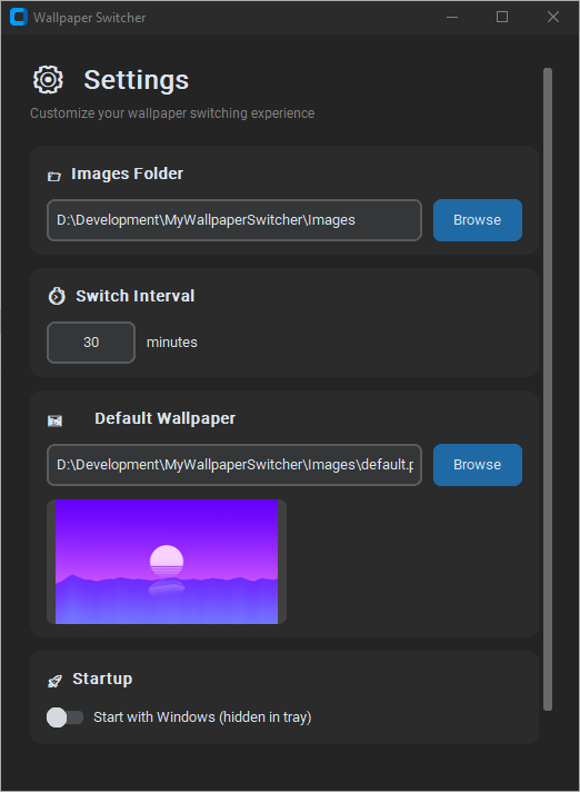 A modern dark-themed settings interface lets users specify the images folder, the switch interval in minutes, and the default wallpaper used when switching is disabled. The default wallpaper preview is shown in the settings window. The settings window can be hidden to the system tray, and the application continues running in the background. From the tray icon, users can enable or disable wallpaper cycling, open the settings window, or exit the application. The tray menu reflects the current enabled or disabled state with checkmarks.